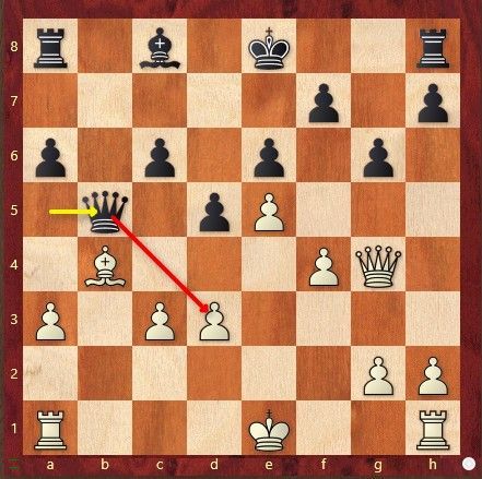 Het was even puzzelen, maar uiteindelijk konden we toch met een gelijkwaardig team naar Tilburg vertrekken. Ik denk dat het vandaag de dag van Akul was! Maar het eerste nieuws was bord 1, waar Ruud al binnen 10 zetten drie keer dezelfde stelling op het bord had en er remise volgde. Maar niet lang daarna was het Akul (met wit) die ons op voorsprong zette. In grootse steil overklaste hij zijn tegenstander. In onderstaande stelling speelde zijn tegenstander zojuist Db5 met aanval op de pion op d3 en de dreiging c5 met aanval op de witte loper Ziet U hoe Akul zijn aanval versterkte?